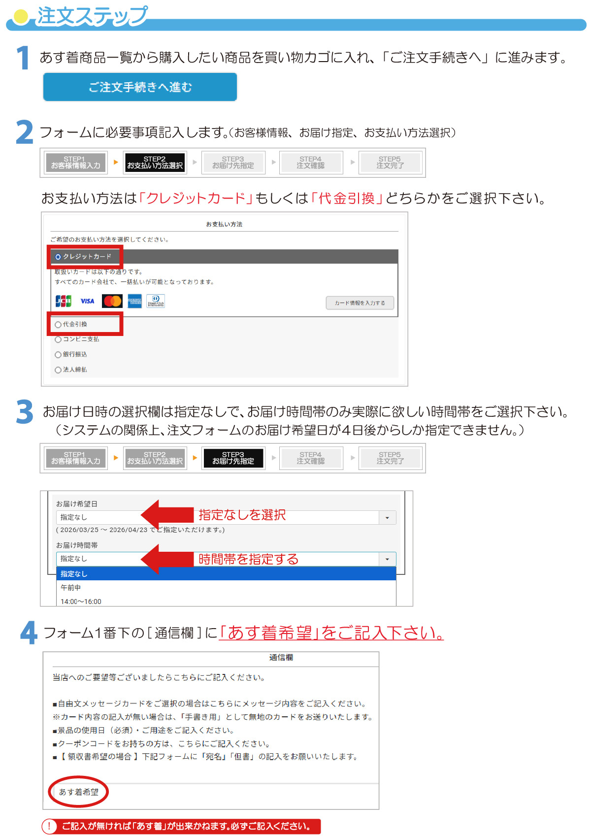 ※通信欄に「あす着希望」の記入が確認できない場合、ご希望日にお届けすることが出来かねます。予めご了承下さい。