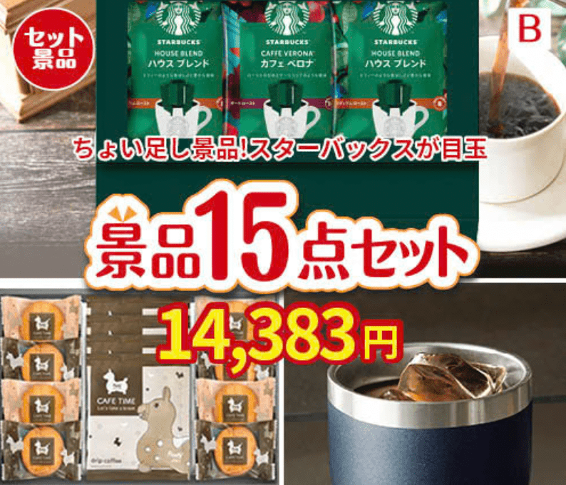 スターバックスのドリップコーヒーや、ゴールドウェットティッシュなど15点が入っており、お得感満載の商品です。
