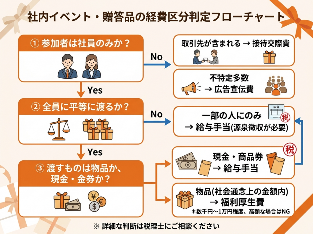 勘定科目は社内イベントの景品を「誰に」「何を」渡すのかによって適切な処理が異なります。
