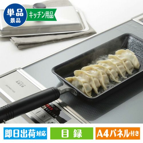電磁調理器対応道具にこだわれば、料理の楽しみはさらに深く。プロに学べ、料理の世界を楽しむ、厳選道具。表面は、ファイバーラインと言われる繊維状の凸凹模様が施されている特殊加工。食材がランダムな点で接触し、油なじみも良く、こびりつきにくくなっております。餃子はもちろん、玉子焼や切身魚にも。●内寸=約12×22cm(深さ約2.8cm)●ガスコンロ可、100・200V電磁調理器対応●ガスコンロ可●100・200V